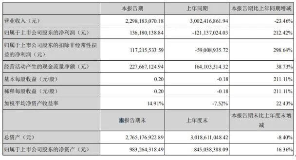 报告期末公司总资产为2,765,176,922.89元,较上年度末下滑8.40%;归属于上市公司股东的净资产为983,264,318.49元,较上年度末增长16.36%。